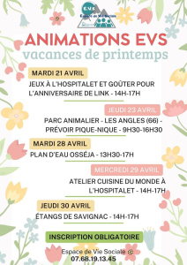 L’Espace de Vie Sociale (EVS) vous invite à profiter d’un programme d’animations convivial et varié durant les vacances de printemps ! Petits et grands pourront partager des moments chaleureux autour d’activités ludiques, sorties nature et ateliers créatifs.